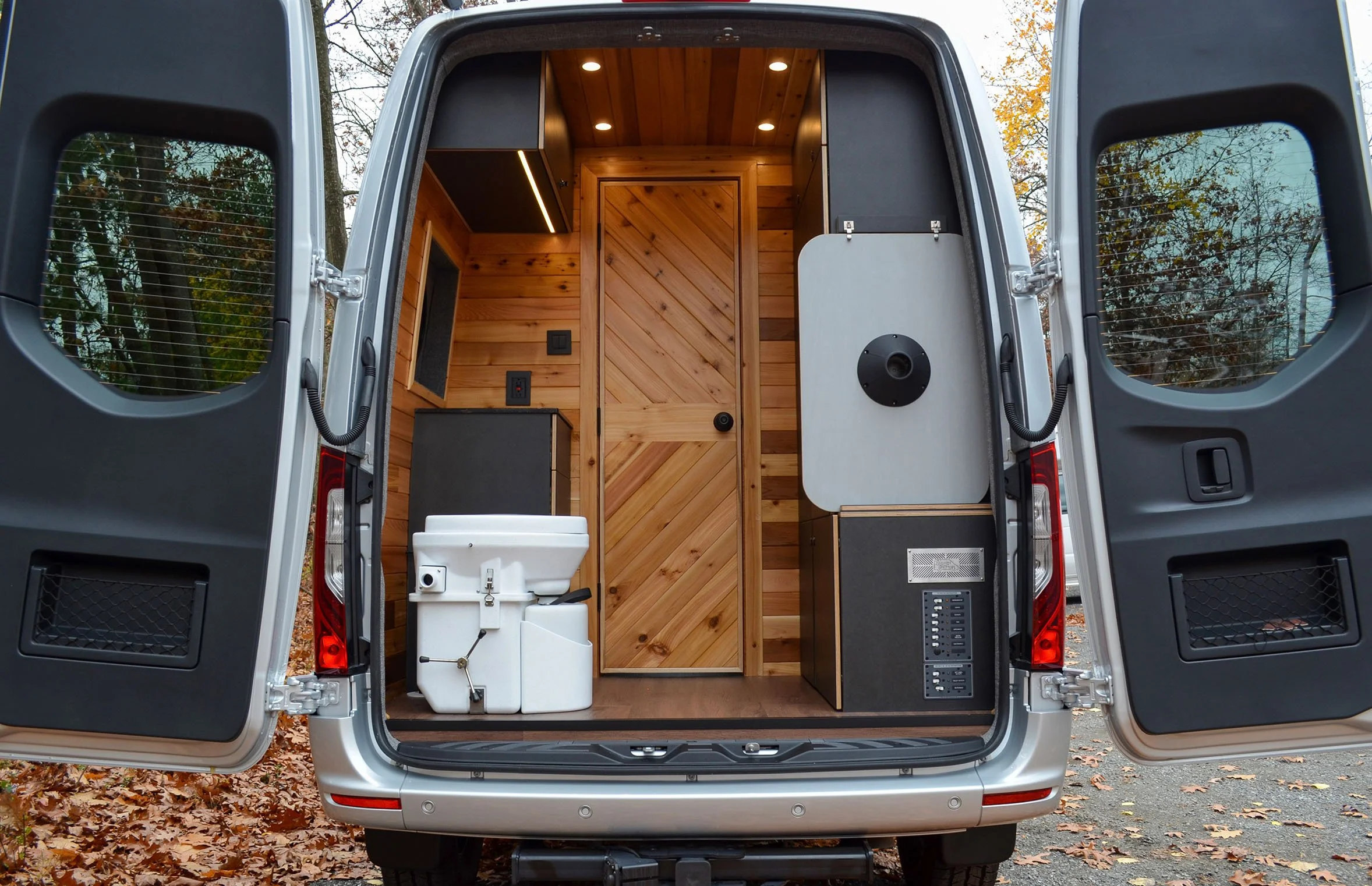 Rear walk-in bathroom with custom Cedar door